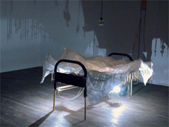Artiste multidisciplinaire, Diane Landry crée des « œuvres mouvelles ». Dans son projet Le Bouclier magique,composé de trois structures de lits-futons recouvertes d’une couverture de papier blanc, l’artiste